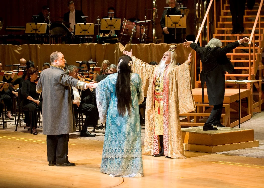 It was exactly 90 years ago in 1926 that Giacomo Puccini’s “Turandot” premiered at Milan’s La Scala Opera House. On that bittersweet occasion, Arturo Toscanini lay down the baton after the last dying notes of Liu’s death scene and uttered these famous words, “Qui finisce l’opera lasciata incompiuta dal Maestro, perché a questo punto il Maestro è morto. (Here ends the opera left unfinished by the Maestro, for at this point the Maestro died.)” Despite what one might feel about the opera’s xenophobic tones and fanciful chinoiserie in the score and the staging, “Turandot” is a great piece of theater with a heartfelt human story, that of an icy princess transformed by love into a human being. In the Pacific Symphony’s highly effective concert staging of “Turandot”, one clearly sensed a beating heart behind all the mise-en-scène spectacles, thanks to a most sympathetic conductor and a top-notch cast.