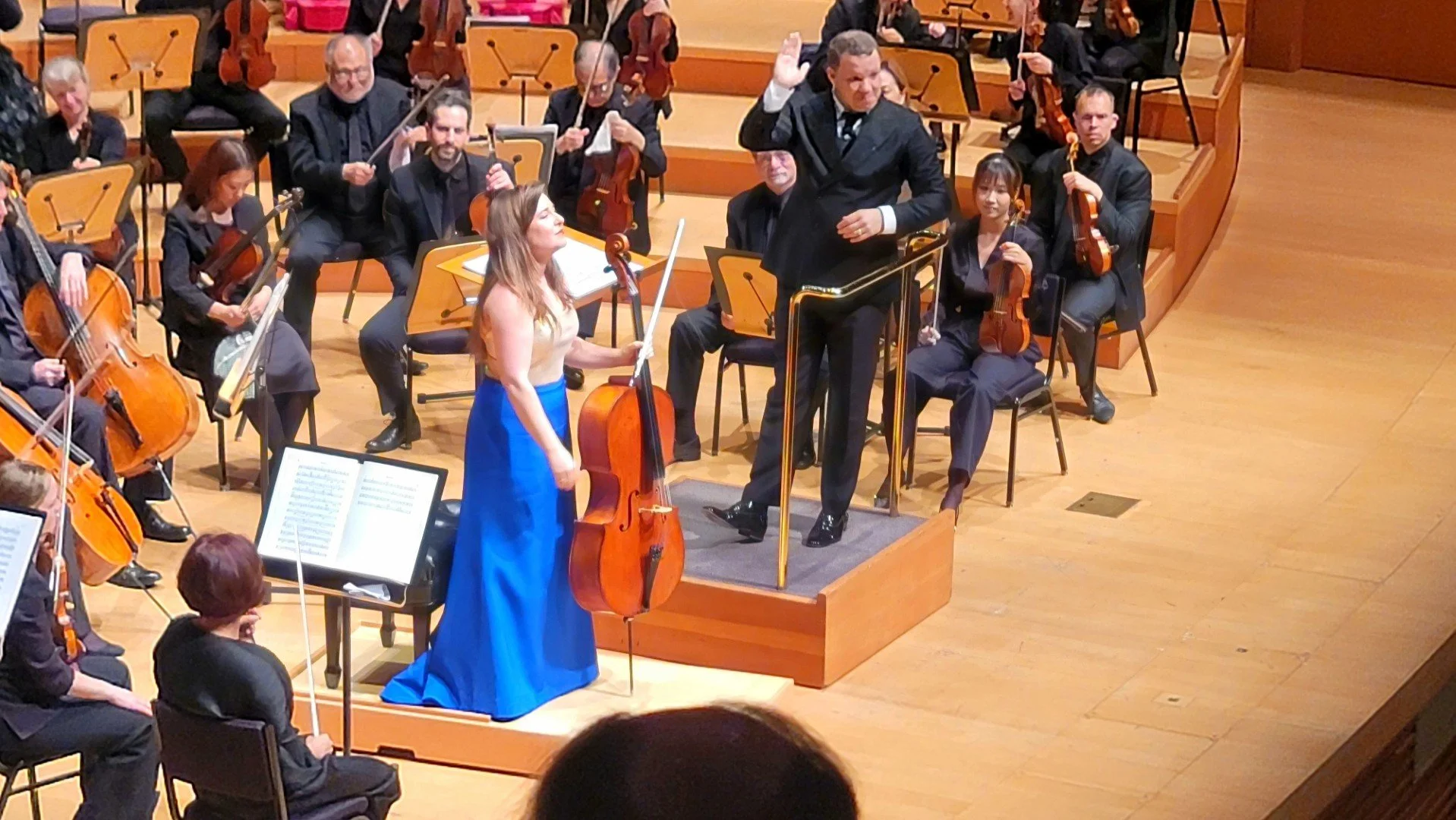 Then came the main event. Alisa Weilerstein took the stage with her 1723–1730 Domenico Montagnana cello – the "Mighty Venetian" – which produced what was possibly the most beautiful, bewitching cello sound I have ever heard in any hall. Unlike the more popular and better-known first concerto, and in a stark contrast to the extroverted opening piece, Shostakovich's Cello Concerto No. 2 is a strange, haunted creature: brooding and spooky, yet built on a Ukrainian street vendor's song hawking bagels ("Who will buy my bagel (bubliki)?"). Only Shostakovich could take baked bread and alchemize it into existential dread. Ms. Weilerstein's playing ranged from passages of almost unbearable tenderness to fierce, clawing outbursts (she literally let her long hair down in several heated moments and cadenzas) – the Montagnana cello's deep, rich, powerful, yet clear tone clinging to the ear after each phrase, like a complex, deep broth lingering on your tongue long after it is consumed. Ms. Weilerstein gave an encore (Sarabande from J.S. Bach’s Solo Cello Suite No. 4) with tender phrasing and tragic overtones, spilled over from the cello concerto.
